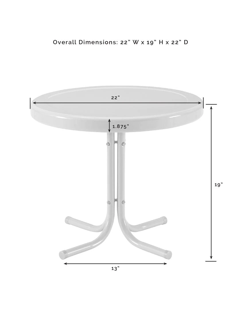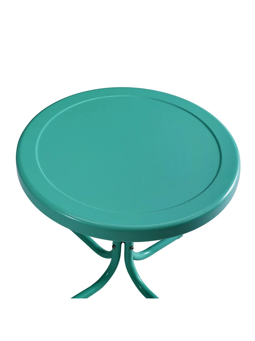 Nostalgia abounds with the Bates 3pc Chair Set. Two vintage-style chairs in vibrant colors surround a simple metal side table for a fun and functional outdoor lounging experience. Each chair features a square back with a unique basket weave design allowing air to circulate for added comfort. With a cantilever base, the chairs offer just enough flex for relaxing outdoors. The table’s sturdy pedestal base easily tucks between the chairs, making the Bates 3pc Chair Set ideal for smaller outdoor spaces.