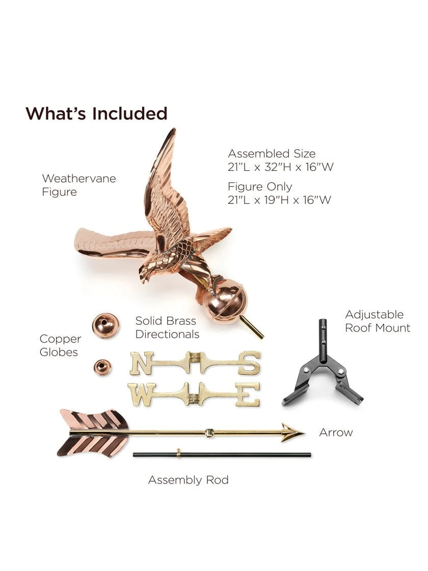 In 1782, the eagle became the official emblem of the new American Union. Today he spreads out his broad wings over the rooftop of smaller structures, sheds, and gazebos. For over 35 years Good Directions Pure Copper Weathervanes have been unsurpassed in style, quality, and durability – perfect for the house-proud homeowner. Bring The Joy of Outdoor Living℠ to your home with this heirloom-quality piece. Easy-to-assemble and install. Includes an all-weather Roof Mount and assembly rod, solid brass 11″L directionals and copper globes. The pure copper will age naturally over time.