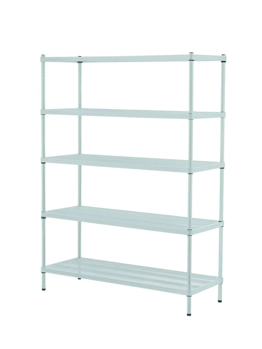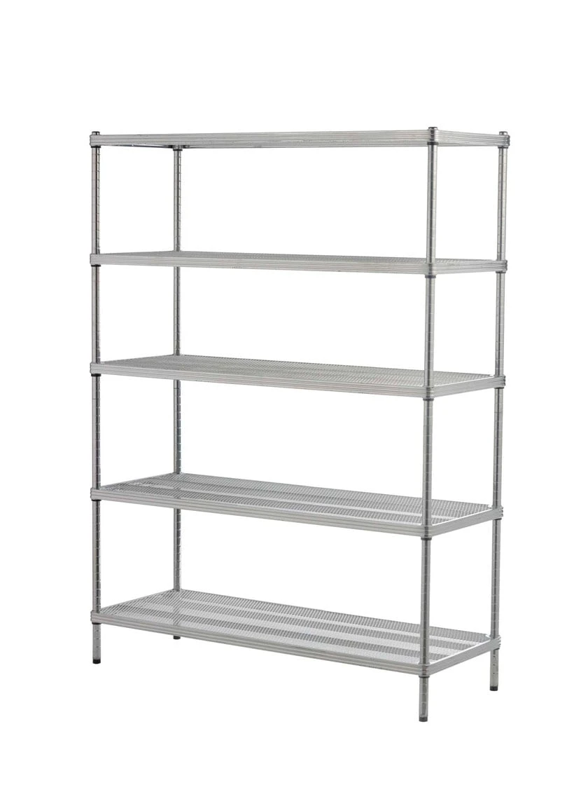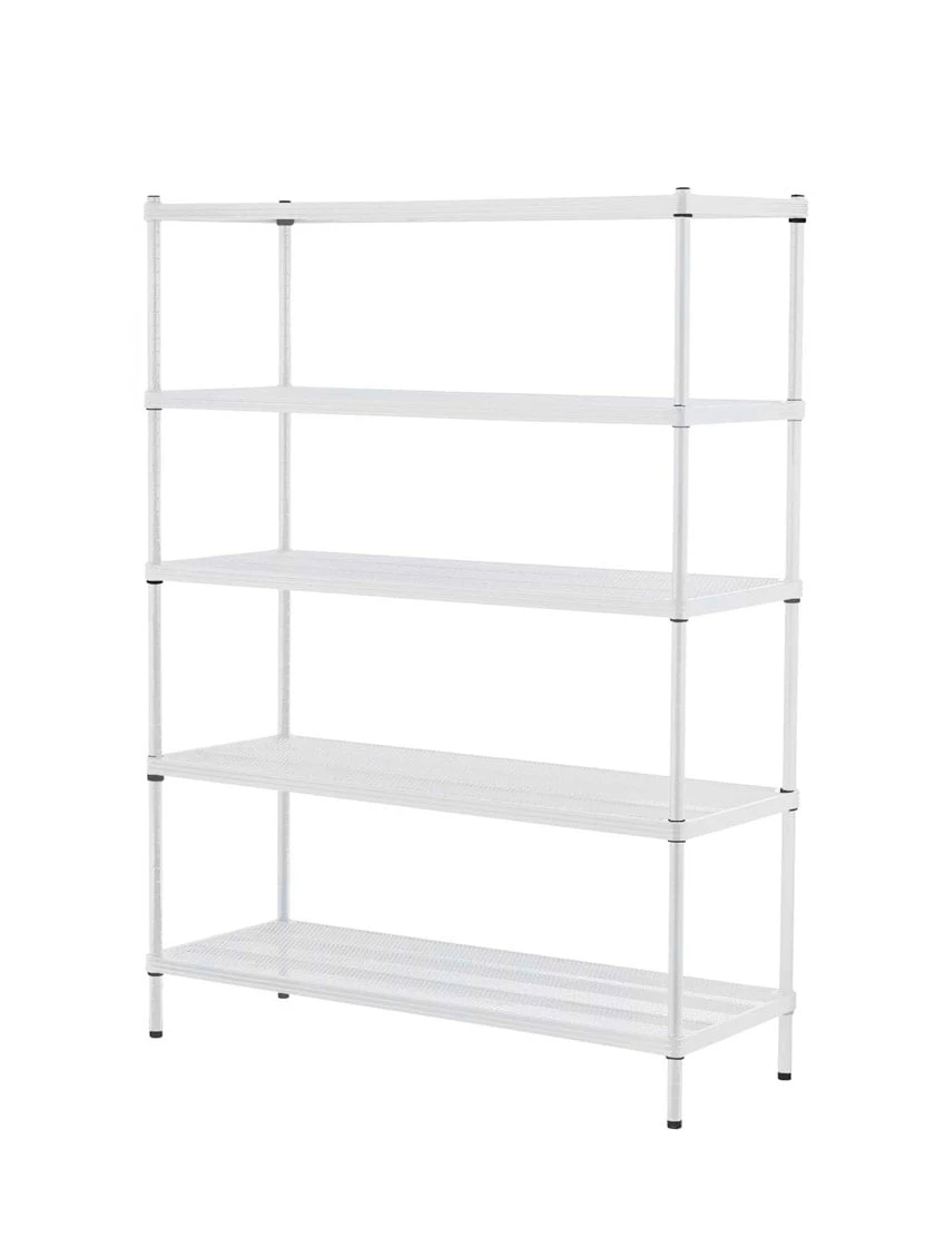 Traditional wire shelves can cause a headache as items can fall through the wide gaps on the shelves. Our brilliantly engineered mesh shelving units use a larger gauge of expanded metal mesh for style, strength and functionality. Each shelf has a weight limit of 440 pounds to safely hold everything from small knick knacks to large, heavy bins. This 5-tier shelving unit is sized perfectly to hold everything from books and decor in the living room to heavy bags of mulch and rock in the garage or garden shed. Shelves adjust in 1″ increments. Assembles easily with no tools required.