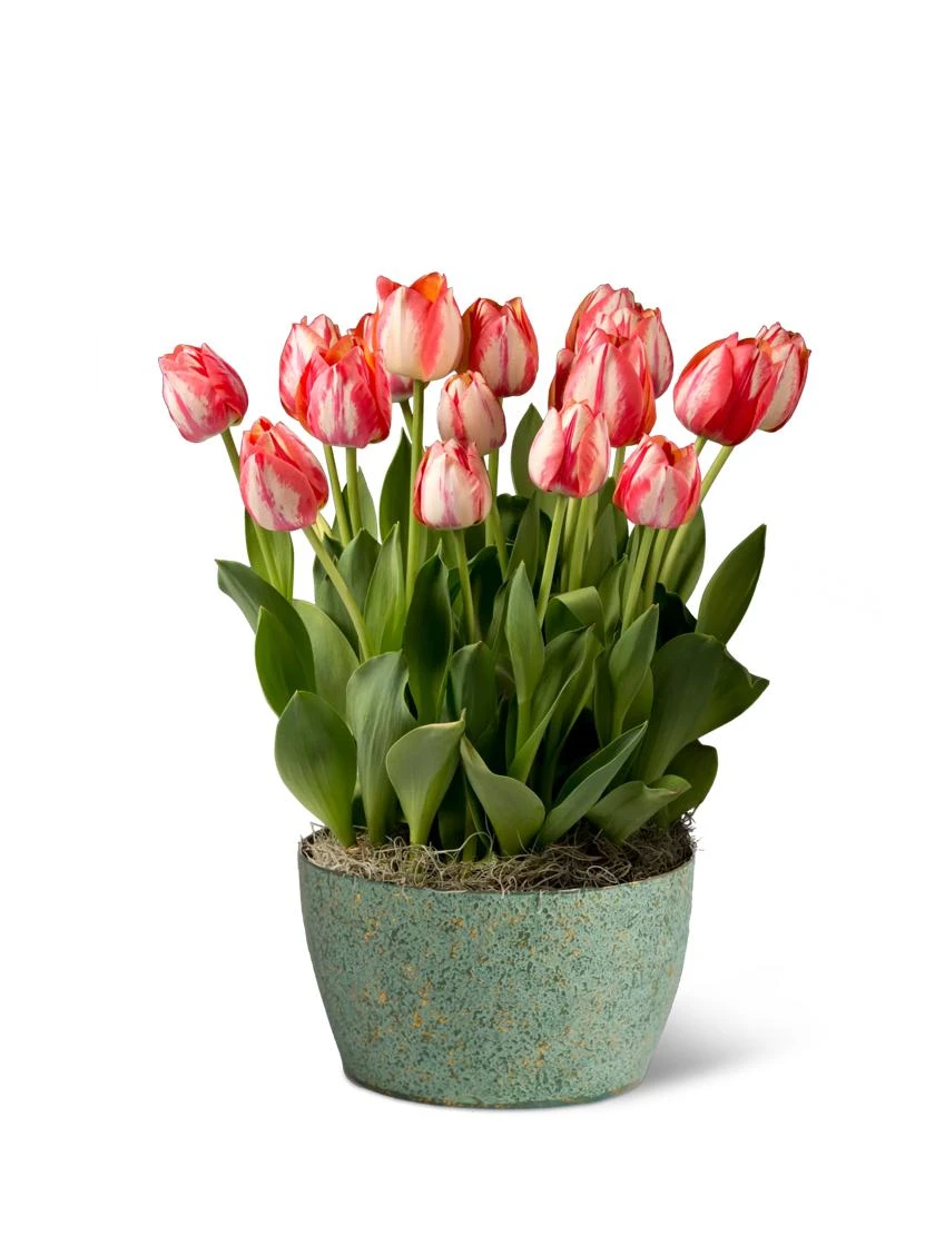Celebrate your love with this simple yet stunning bulb garden. 18 beautiful ‘Spryng Break’ tulips displayed in a 10.5″ reusable metal cachepot, burst into bloom with petals of rich cream lined with luscious pink-red flames. With weeks of blooms to keep your sweetheart thinking of you, these bulbs will begin their lovely show in about three weeks.